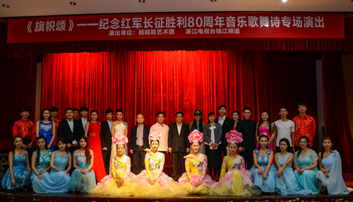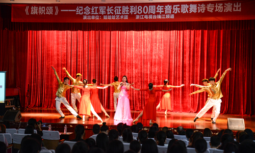千山万水,谱写壮丽史诗;不忘初心,踏上新的征程。10月20日中午,由娃哈哈艺术团、浙江电视台钱江频道主办的“旗帜颂——纪念红军长征胜利80周年音乐歌舞诗专场演出”在我校月明音乐楼上演。校党委书记汪俊昌亲切接见了艺术团一行,和师生们一起观看了演出,并对学校师生弘扬长征精神提出要求。
