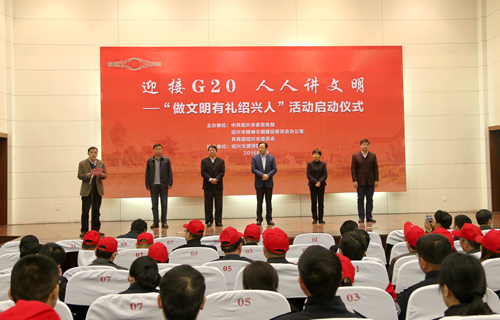启动仪式上,大家一同观看了杭州主会场活动电视直播。随后,绍兴分会场活动正式开始。省道德模范董国光宣读《做文明有礼绍兴人倡议书》,号召大家从身边做起,做到言谈举止文明有礼、公共场合文明有礼、邻里相处文明有礼、行路驾车文明有礼、旅游观光文明有礼、网上交流文明有礼,为“建设生态绍兴、共享品质生活”努力。何加顺部长、丁晓燕副市长、沈赤副书记等领导分别为社会各界代表分发《做文明有礼绍兴人》口袋书,并为文明交通志愿服务劝导队、文明礼仪志愿服务宣讲队、文明单位志愿服务队、“五水共治”志愿服务队、“点亮一盏灯”、“孺子牛”志工服务队等有关志愿服务队授旗。何加顺部长宣布“迎接G20 人人讲文明——做文明有礼绍兴人”活动正式启动,在场的“文明使者”响应号召,上路劝导不文明行为。