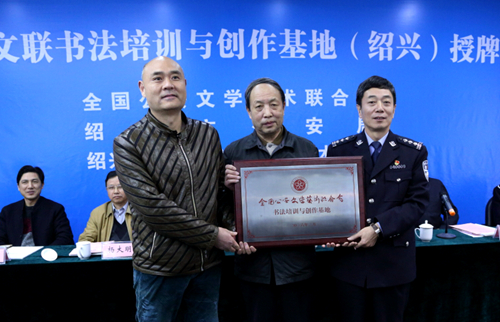 仪式上,全国公安文联《公安书法》执行副主编殷昌军宣读《关于在绍兴设立全国公安文联书法培训与创作基地的批复》文件,全国公安文联副主席、书协主席李忠信为基地授牌。