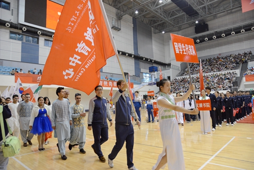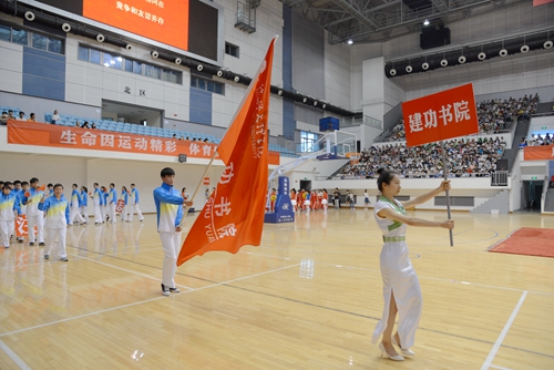 在观看了校党委宣传部为本届运动会创作的专题微电影后,学生代表高举国旗、校旗、会徽,书院、留学生、教职工代表团依次入场。各入场方队极具专业特色和运动精神的展示,以及精心编排的方阵表演赢得观众台上阵阵掌声。今年是我校首次尝试以书院为单位组织参加运动会。入场仪式上,11位书院院长带领着各自书院的运动健儿们,迈着整齐矫健的步伐,喊着铿锵有力的口号,充分展现了书院深厚的文化内涵和当代大学生的青春风采。值得一提的是,今年我校留学生首次组队参赛。在开幕式上,这支由来自美国、墨西哥、韩国等13个国家的留学生组成的代表团引人注目,为此次校运会增光添彩。