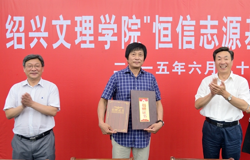 仪式上,茹振刚先生、张友珍常务副会长、唐和祥副书记签订了三方协议。钱水祥副书记代表学校接受捐赠,市政协主席陈长兴向茹振刚先生颁发捐赠证书,周达军书记向茹振刚先生赠送美术作品和颁发客座教授聘书。