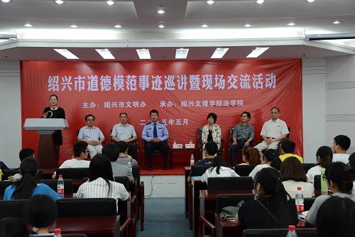 2015年绍兴市道德模范事迹首场巡讲活动于5月13日下午在我校河西校区图书馆一楼报告厅举行。绍兴市委宣传部部务会议成员、市文明办副主任徐人杰,绍兴市文明办城市文明创建处副处长李建华,第三届绍兴市道德模范潘旗龙、郭秀珍,法学院师生代表120余人参加了本次活动,共同感受道德模范事迹带来的正能量。活动还邀请了由我校师生代表组成的宣讲团中的三位同志为大家宣讲。