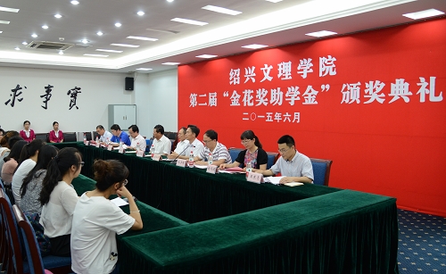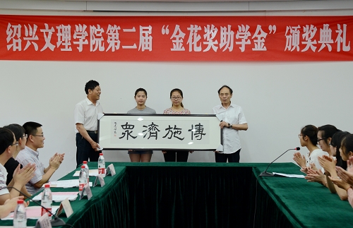 唐和祥副书记代表学校接受绍兴远大轻纺原料有限公司的第3次捐赠,对李马鑫先生兄弟热心教育事业、关心年轻一代成长的善举表示感谢和崇高的敬意。同时也向获得第二届“金花奖助学金”的各位同学表示热烈的祝贺。他发言表示,绍兴远大轻纺原料有限公司这种尊重知识、尊重人才、尊师重道的企业文化与党的十八大所提出的“立德树人”是教育的根本任务不谋而合。李马鑫先生身体力行,所倡导的勤俭节约,尊师重教的做法值得大家尊敬。我们在平时的工作和生活中要积极践行社会主义核心价值观,自觉弘扬中华民族的传统美德。他同时也指出,今天获奖同学得到的不只是一份奖学金、助学金,收获更多的是一份爱心、一份期待、一份责任。他希望获奖同学能再接再厉,自强不息,敢于追求梦想;要不断创新,战胜困难,感恩社会,用自己的实际行动和优异成绩去回报社会对我们的关爱。