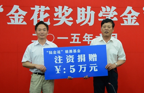6月3日下午,我校第二届“金花奖助学金”颁奖典礼在铁城科教馆一楼会议室举行。李马鑫先生与其弟弟李兴友先生专程赶到学校,兄弟俩亲自为第二届金花奖助学金获得者颁奖,并兑现之前的承诺,再次向陆金花慈善基金注入5万元,目前基金总数已达109万。