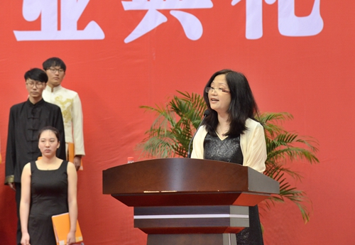 毕业生亲属代表、化学化工学院章思怡同学的母亲任联君女士致辞。她对孩子在4年大学生活中的收获和成长表示欣慰,对学校和老师的辛勤付出表示由衷感谢。她希望全体毕业生在未来的人生道路上勇于担当,为自己、为母校、为国家书写有意义的人生。