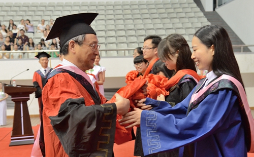 叶飞帆校长致辞。“从小到大,你们经历过无数的毕业典礼,今后也将会有。但今天是你们人生中最荣耀的一次毕业典礼。这里是你们迈向社会的第一个台阶!”叶飞帆校长向所有2015届本科毕业生和硕士研究生表示了由衷的祝贺!他以感恩、责任和祝福三个关键词寄语毕业生们。要感恩父母,是他们在你们的人生成长路上殚精竭虑、牵肠挂肚;要感恩教职员工,他们在各自的岗位上教育育人、管理育人、服务育人,教导你们做人、做事、做学问,指引你们前行的道路;要感恩同学,是那份如手足般的关心、帮助和友爱让你们的大学生活更加精彩;同时也要感恩社会各界人士,感谢他们对学校发展的支持,以设立奖助学金、提供就业、实习岗位等多种方式关注文理学子的成长成才。