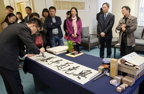 5月14日,代表团在奥克兰大学参加了“兰亭书法学堂”揭牌仪式。叶校长代表学校在仪式上发表演讲。他表示,兰亭书法学院是我校的一张金名片,书法是中华文化的载体,学校可以书法作为平台,通过“兰亭书法学堂”的运作模式到海外设立书法课堂,让我校的师生走出国门,到海外开展书法教学和实践活动,把中国的书法艺术推广到海外,同时以此来促进学校教育国际化的进程。参加揭牌仪式的有奥克兰大学孔子学院外方院长姚载瑜女士、奥克兰大学艺术学院副院长Jim Speers先生、我国驻奥克兰总领事馆教育领事房东波先生以及新西兰社会各界人士。在仪式上,我校人文学院对外汉语的学生向与会者介绍了“兰亭书法学堂”。根据奥克兰大学的安排, 2015年7月12日将会举行“兰亭书法学堂”的开班仪式,奥克兰大学艺术学院的学生将有机会把书法作为一门选修课进行学习。