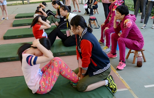 专家组对我校2012级外语学院、医学院、法学院、纺织服装学院和人文学院共200余名学生进行了抽测。测试项目主要为:坐位体前屈、50米跑、立定跳远、1000米跑(男)/800米跑(女)和引体向上(男)/仰卧起坐(女)5个项目,每个项目的测试成绩各占总成绩权重20%。