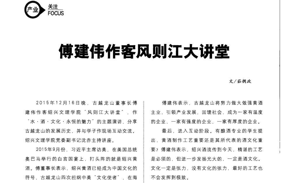 《中国酒》杂志刊发文章 报道傅建伟作客风则江大讲堂
