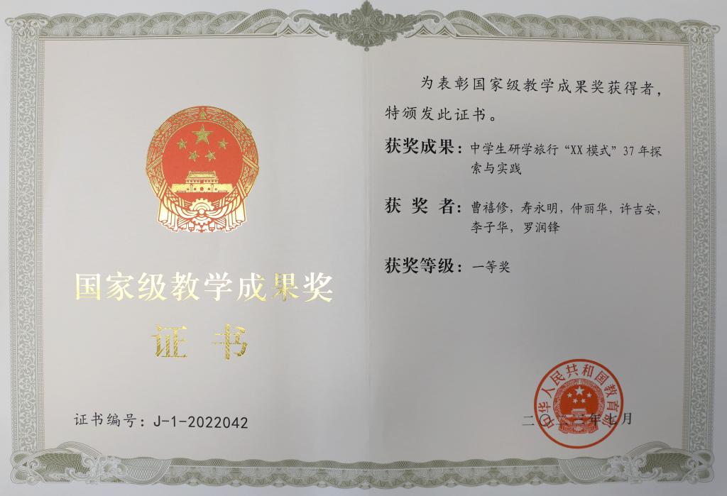 《中学生研学旅行“XX模式”37年探索与实践》获2022年基础教育国家级教学成果奖一等奖,实现了学校国家级教学成果奖一等奖零的突破。