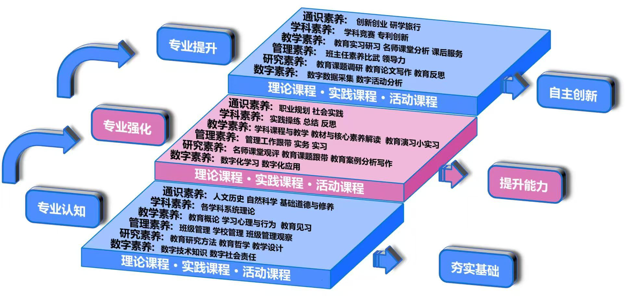 目前,教师教育课程普遍存在“价值引领不强、能力培养失衡、文化特色缺失、资源共享不足”等四大难题,使得师德教育存在“重知识灌输、轻行为养成”现象,师范生教育情怀与职业认同感相对薄弱。同时,课程片面追求“短平快”技能训练,使得技能与素养培养割裂,导致学生知识结构碎片化、综合育人能力薄弱等。为破解上述课程问题,学校重新梳理课程内容,建构课程结构,形成师范生六大核心素养,即通识素养、学科素养、教学素养、管理素养、研究素养、数字素养,以此作为卓越师范生培养的主要内容,逐步形成“厚情怀尚师德强实践善创新”结构化教师教育课程体系。其中,通识课程有利于培养师范生优秀品格和广博视野,学科课程奠定专业深厚基础,教学课程夯实教学能力,管理课程强化育人素养,研究课程夯实终身发展素养,数字课程提升数字素养。