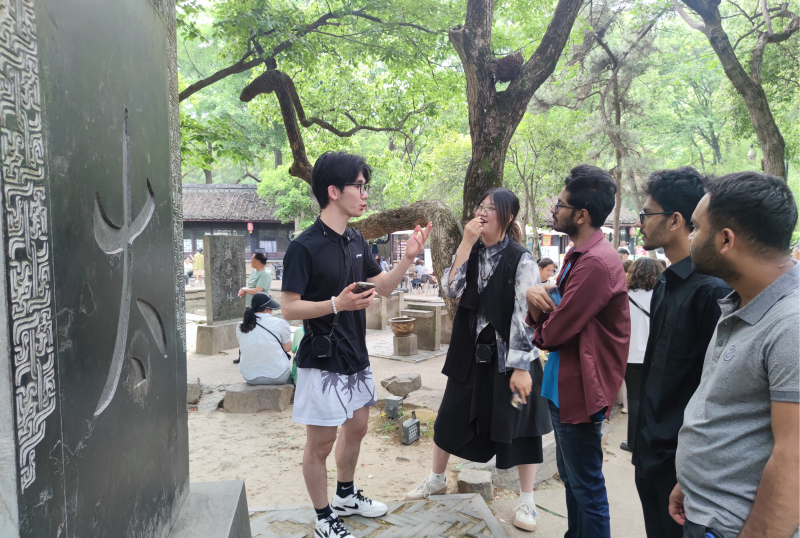 “五一”期间,学生志愿讲解员们每日清晨便抵达景区,以饱满的精神状态迎接游客。他们穿梭于鹅池、兰亭碑亭、曲水流觞、流觞亭、御碑亭等核心景点,用丰富多样的方式为游客带来深度文化体验。面对老年游客,讲解员们放慢语速,耐心讲解各景点的历史渊源;对于青少年群体,讲解员们设计了“探御‘一’之瑕”趣味互动,激发孩子们探索的热情。作为外国语学院学生他们更是充分发挥专业优势,承担起重要的涉外讲解服务工作。面对外国游客,讲解员凭借扎实的语言功底和文化底蕴,开展了一系列精彩纷呈的涉外讲解服务。一位来自孟加拉国的游客在志愿讲解员的指导下,写下一个“永”字,满心欢喜。一位来自美国的游客激动地说:“这些志愿者的讲解太棒了!以前我只知道中国书法很美,但通过他们的介绍,我了解到了背后如此深厚的文化内涵,这趟旅行太值得了!”志愿讲解员们用真诚的态度和专业的知识,打破语言障碍,搭建起中外文化交流的桥梁,让来自世界各地的游客深刻感受到中国传统文化的博大精深与独特魅力,使兰亭文化走出国门,在世界舞台上绽放光彩。