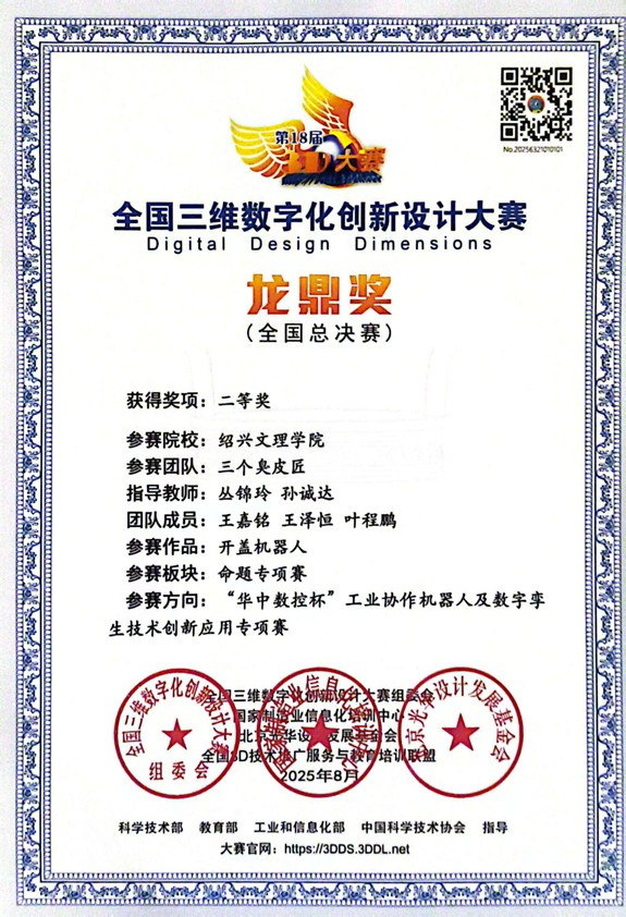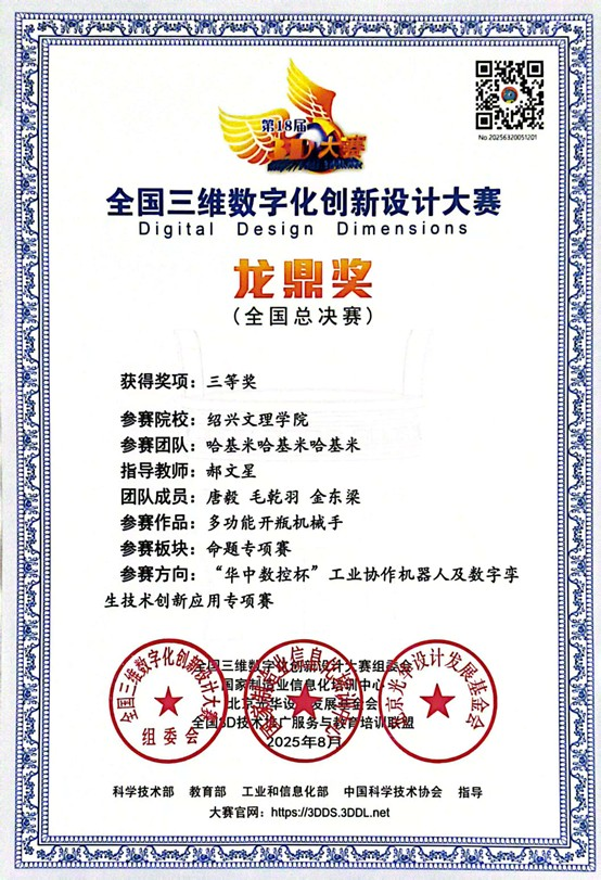 智能工程学院机械硕士研究生王嘉铭、王泽恒、叶程鹏的设计作品“开盖机器人”(指导教师:丛锦玲、孙诚达),荣获全国总决赛二等奖;机械硕士研究生唐毅、毛乾羽、金东梁的设计作品“多功能开瓶机械手”(指导教师:郝文星),荣获全国总决赛三等奖。